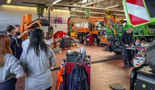Danach kam der beste Teil: im Hof konnten alle den Mercedes-Benz Unimog und die Baumaschinen von JCB hautnah erleben und selbst testen. Neben Erklärungen, einer Fragerunde und ersten Trockenübungen mit dem Unimog, konnten die jungen Besucher auch Probesitzen und selbst an die Bedienung. Besonders beliebt war die Challenge, einen Golfball mithilfe der Hydraulik durch ein Labyrinth in der Baggerschaufel zu manövrieren.