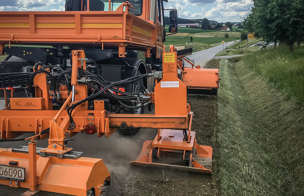 Zur Bankettaufbereitung sind Aufbaulösungen für multifunktionale Geräteträger wie dem Unimog besonders effizient. Im Gegensatz zu Selbstfahrern realisiert der Unimog kürzere Umsetzzeiten und bietet die Möglichkeit des Ein-Mann-Betriebes.