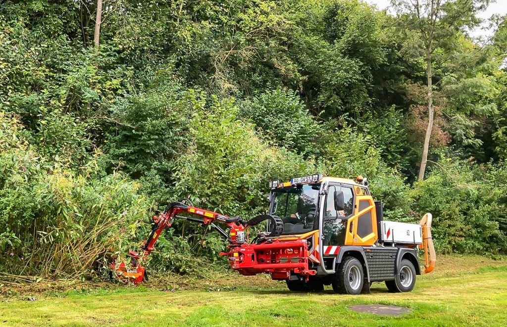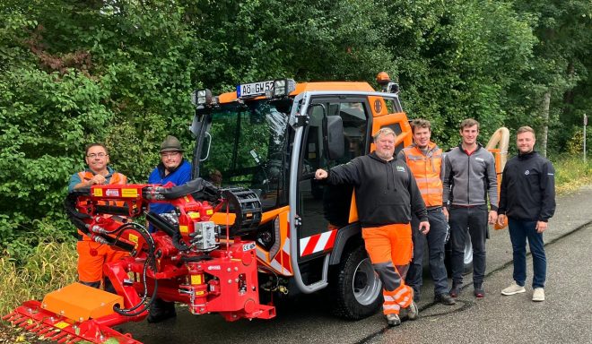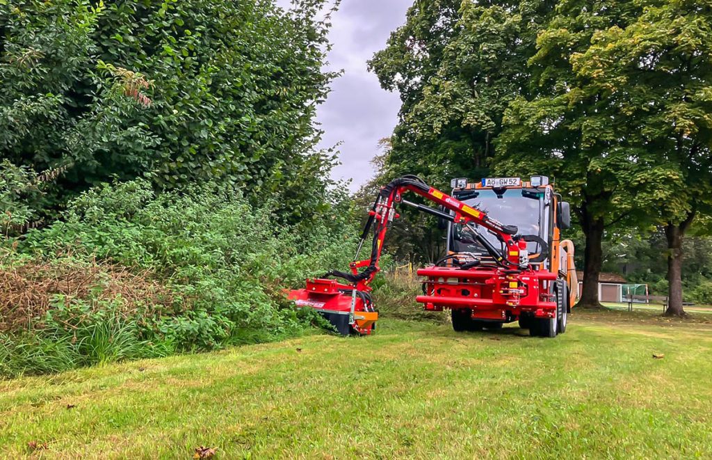 Zusätzlich ist der Geräteträger mit einem Dücker DBM 400 Ausleger ausgestattet. Dieses Anbaugerät erweitert den Funktionsumfang des Fahrzeugs erheblich, insbesondere im Bereich der Grünpflege an schwer zugänglichen Stellen. Der hydraulisch gesteuerte Ausleger ermöglicht präzise Arbeiten entlang von Straßen, Gräben und Böschungen und erhöht die Effizienz bei der Pflege kommunaler Flächen.