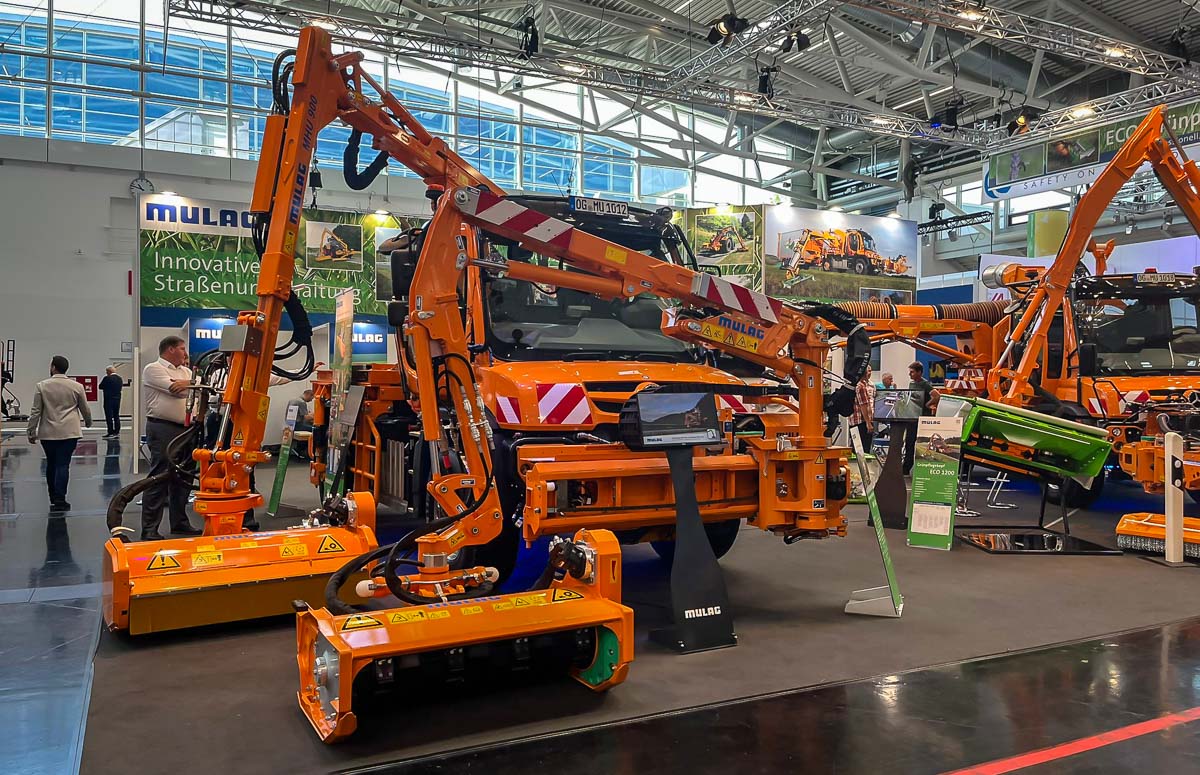 Der zweite ausgestellte Unimog ist mit dem Lichtraumprofilschneidegerät FSG 2000 ausgestattet. Das macht ihn ideal für das Freischneiden von Verkehrswegen, da der Einsatz für Ästen und Gehölz bis 150 mm Schnittstärke möglich ist. Der U 43o ist außerdem mit einem MFK 500 Frontausleger von MULAG ausgestattet. Dieser hat eine Reichweite von bis zu 7,0 Metern, was das Fahrzeug besonders flexibel und effektiv beim Freischneiden von Lichtraumprofilen macht.